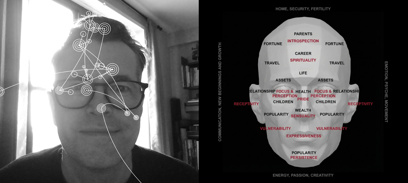 An in-browser exploration of self-reflection and digital divination. This is a prototype of an alternate Zoltar that uses the user’s webcam to take a photo of them then draw a constellation map on their image that can be interpreted based on the point of origin, location, and density of the lines. The system for interpretation is loosely based on a mix of Celtic and Chinese (xiang mian) symbology and represents the dominant forces in the subjects life at the moment of calculation.